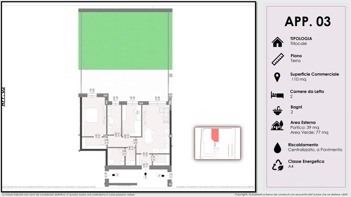 Dalla zona giorno si accede direttamente all’esterno, dove si sviluppano un portico di circa 39 mq, perfetto per momenti di relax e pranzi all’aperto, e un giardino privato di circa 77 mq, ideale per vivere appieno gli spazi verdi in ogni stagione.